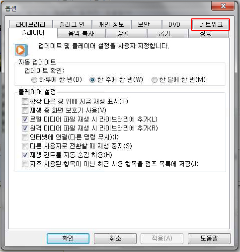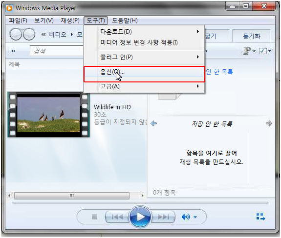 가. 미디어 플레이어의 도구 메뉴 → 옵션을 선택합니다.![]() |