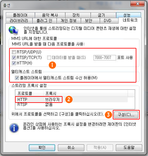 | 다. 네트워크 탭의 MMS/URL에 대한 프로토콜에서 RTSP/TCP와 HTTP만 체크합니다. 스트리밍 프록시 설정에서 HTTP를 선택한 후 구성 버튼을 클릭합니다. ![]() |