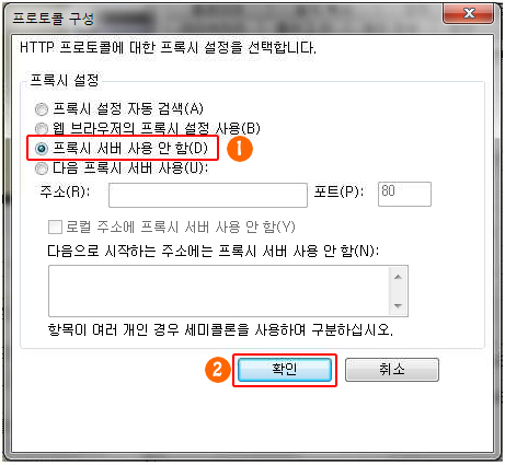 | 라. 프로토콜 구성 대화 상자에서 프록시 서버 사용 안함을 선택하고 확인버튼을 클릭합니다. ![]() |